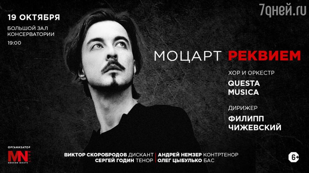 19 октября в Большом зале Московской консерватории хор и оркестр Questa Musica под руководством известного дирижера Филиппа Чижевского представят Реквием Вольфганга Амадея Моцарта, самый таинственный и драматичный шедевр гениального композитора. Трогательное и ошеломляющее, безмятежное и патетическое, мрачное и светоносное, это произведение захватывает от первой до последней ноты. Солистами в этот вечер выступят Виктор Скоробродов (дискант), Сергей Годин (тенор), Андрей Немзер (контратенор), Олег Цыбулько (бас).