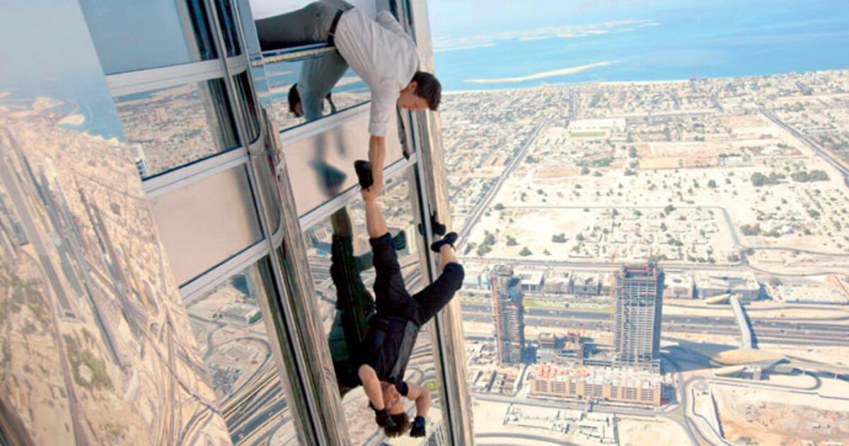 «Там правда кто-то есть или нам померещилось?» — волновались люди. «Да, здесь снимают кино. А та «козявка» в небе — сам Том Круз!» — отвечали довольные экскурсоводы. Такого столпотворения туристов, как за те пять дней, что съемочная группа четвертого фильма киносериала «Миссия невыполнима: Протокол Фантом» провела на «Бурдж Халифа», местные старожилы не припомнят. На самый верх их, разумеется, не пускали. Но даже то, что они могли увидеть с этажей ниже 130-го (а именно там группа провела больше всего времени), казалось невероятным. Круз лихо бегал по стене вверх и вниз, а также вокруг здания, не хуже, чем какой-нибудь человек-паук! В какой-то момент, правда, Том на секунду утратил координацию движений и после прыжка вместо того, чтобы «приземлиться» на стену ногами, с размаху ударился об нее головой.