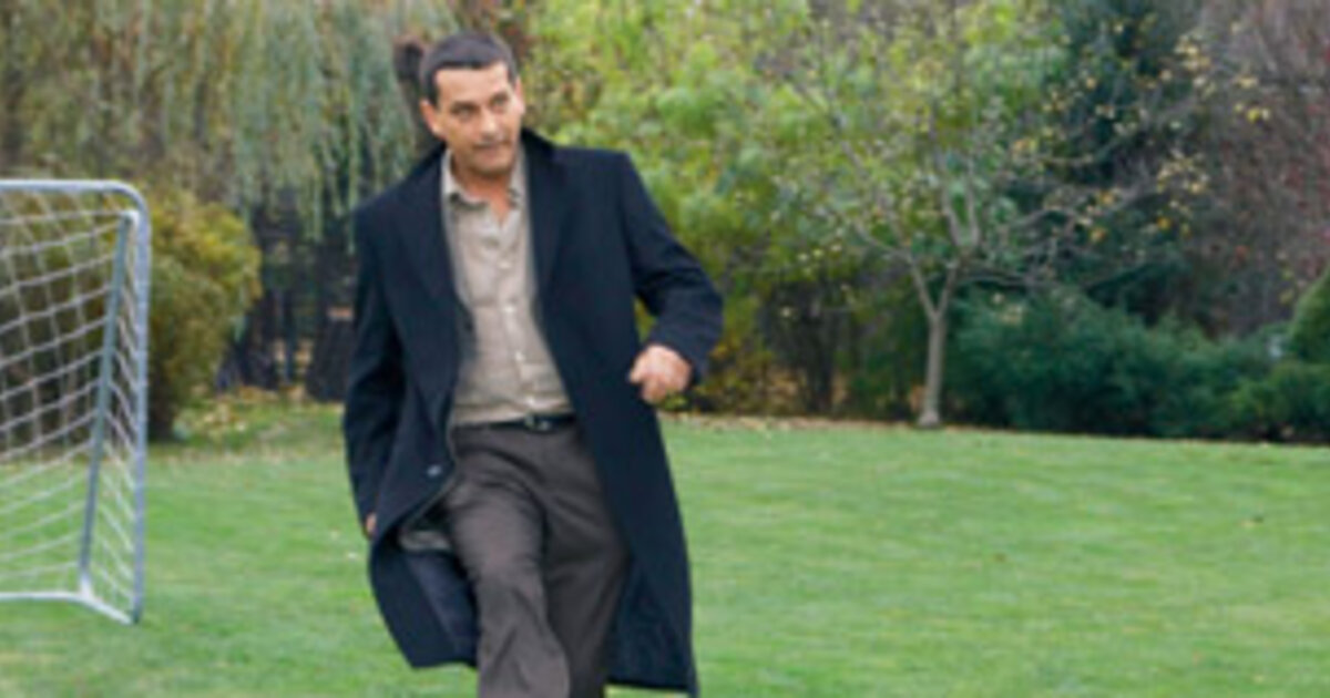 Ярослав Бойко в перерыве между съемками «пробует ногами» футбольную площадку во дворе их нового дома.