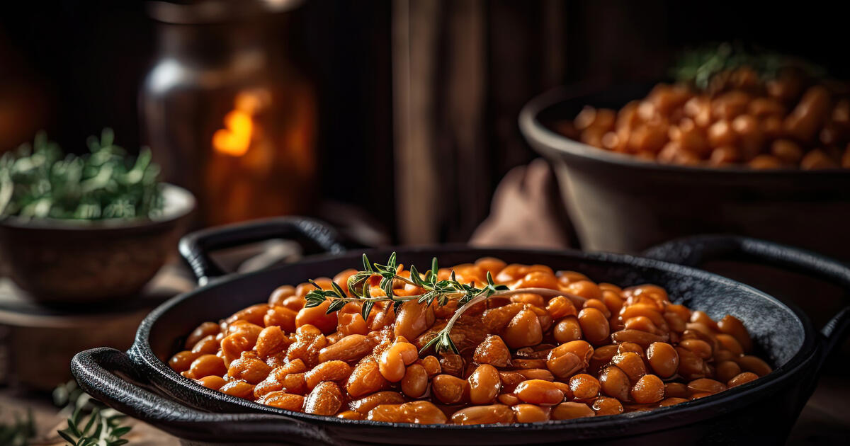 Смешайте в большой миске фасоль, лук, сахар, кетчуп и горчицу. Вылейте смесь в форму для выпечки и отправьте в разогретую до 180С духовку на 35–40 минут, пока фасоль не загустеет. Готовое блюдо можно украсить зеленью и звать всех к столу.