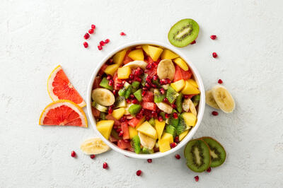 Ягоды (свежие или замороженные), кусочки банана, яблоко, сыр, зелень, ванильный сахар.