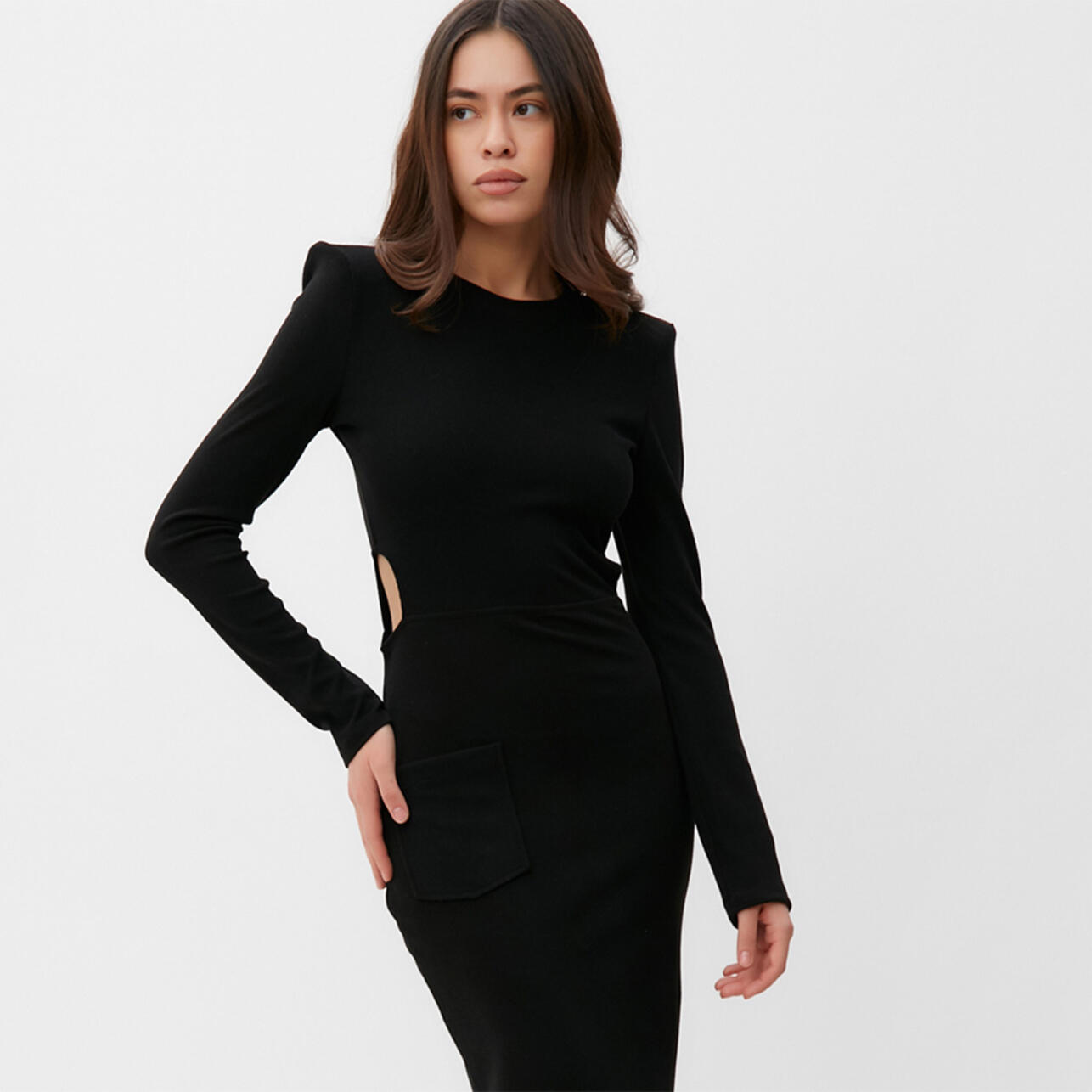 Подходящим для вечеринки или торжественного события будет классическое черное платье в пол, изюминка которого — вырез на уровне талии. Модель выполнена из вискозы с добавлением полиэстера. Это позволяет изделию долго сохранять внешний вид.