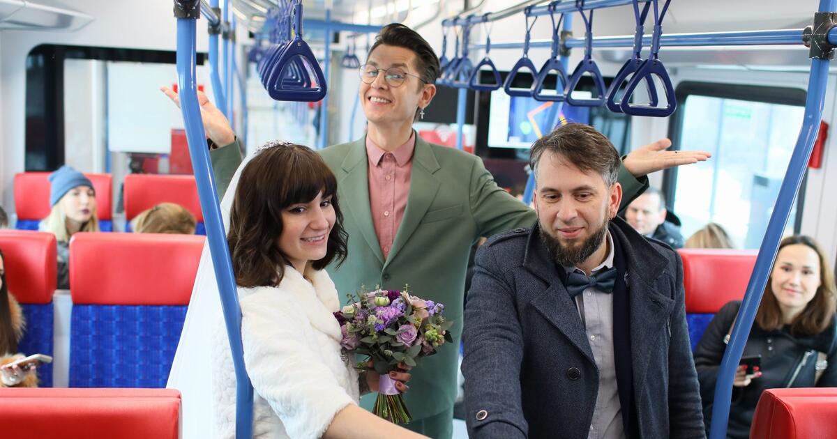 На станции Одинцово будущие новобрачные вошли в вагон, где по своим делам ехали обычные пассажиры. Каково же было их удивление, когда они поняли, что стали гостями настоящей свадьбы, которую, вдобавок, провел известный эксперт моды и телерадиоведущий Владислав Лисовец!