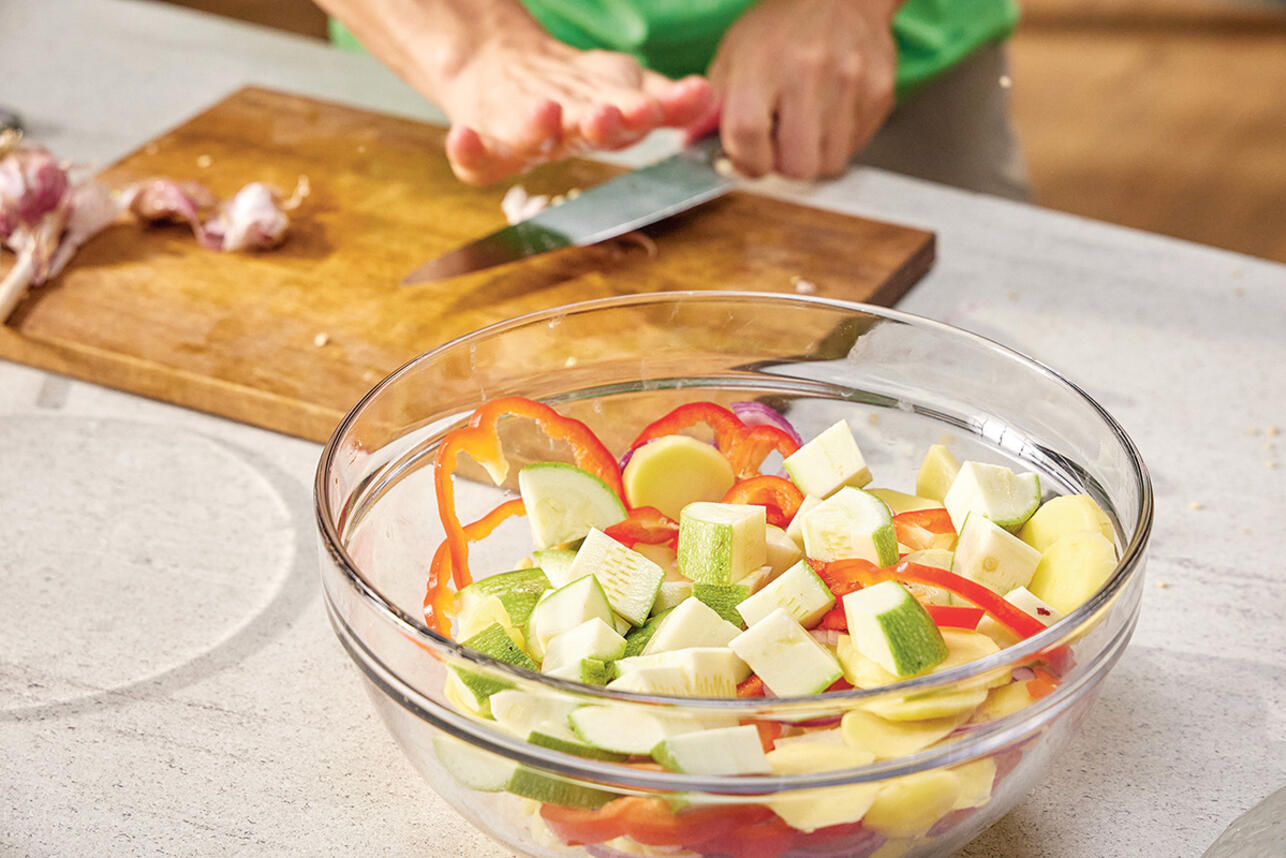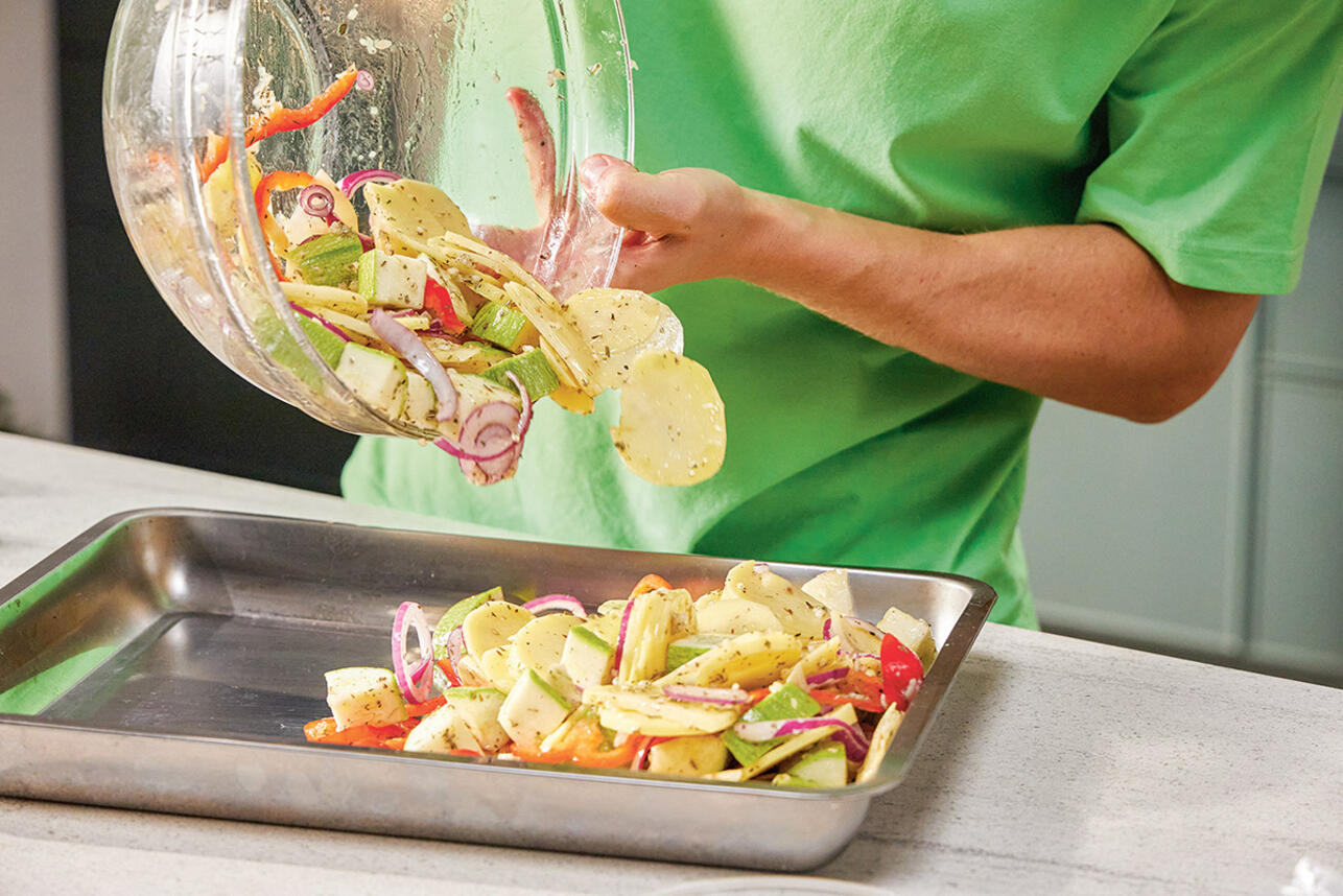 Переложить овощи на большой противень, равномерно распределить по поверхности и отправить запекаться в заранее разогретую до 210 °С духовку на 20 минут с конвекцией. Овощи должны приготовиться на 60%.