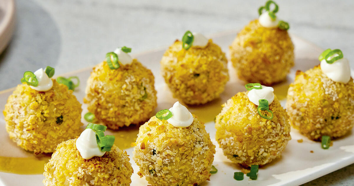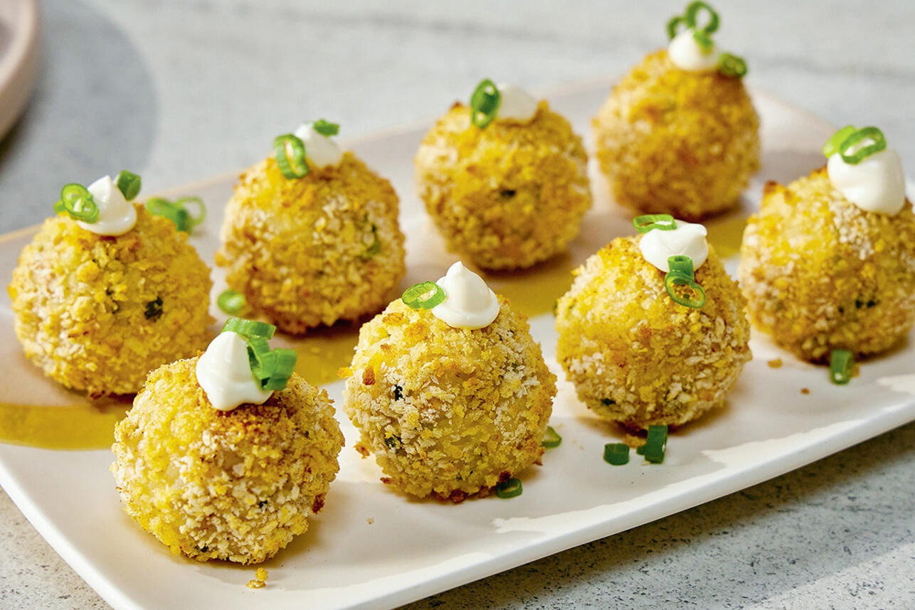 Готовые шарики переложить на большую сервировочную тарелку, отсадить майонез на каждый шарик и украсить нарезанным зеленым луком.