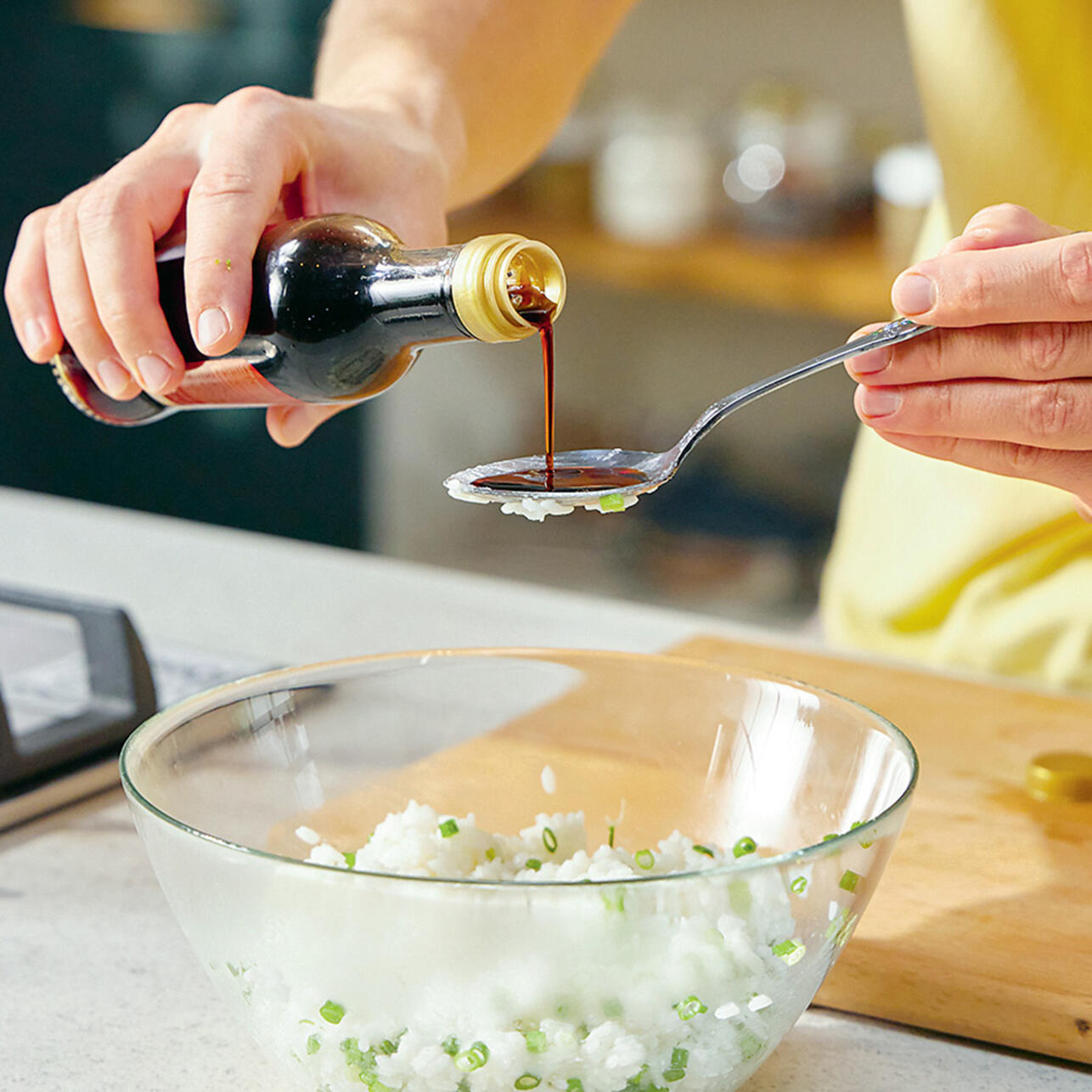 Добавить лук к рису, влить соус терияки, поперчить и перемешать.