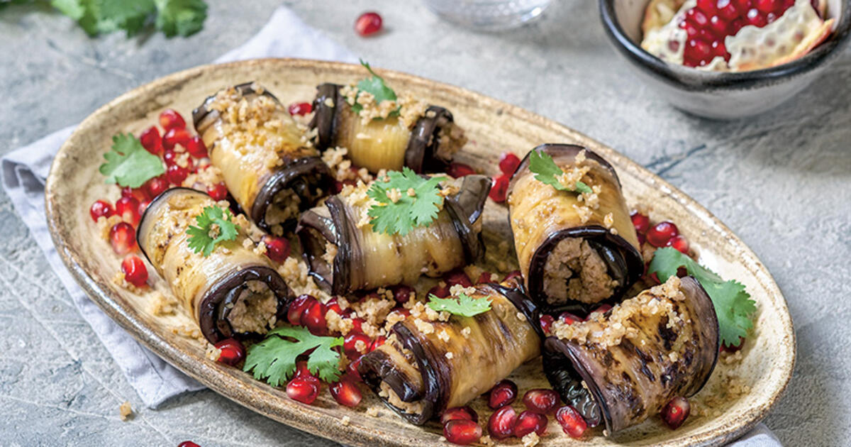 Накрыть баклажаны бумажным полотенцем на 10 минут, затем выложить на них начинку, скатать рулетиками и посыпать оставшимися орехами и зеленью и зернами граната.