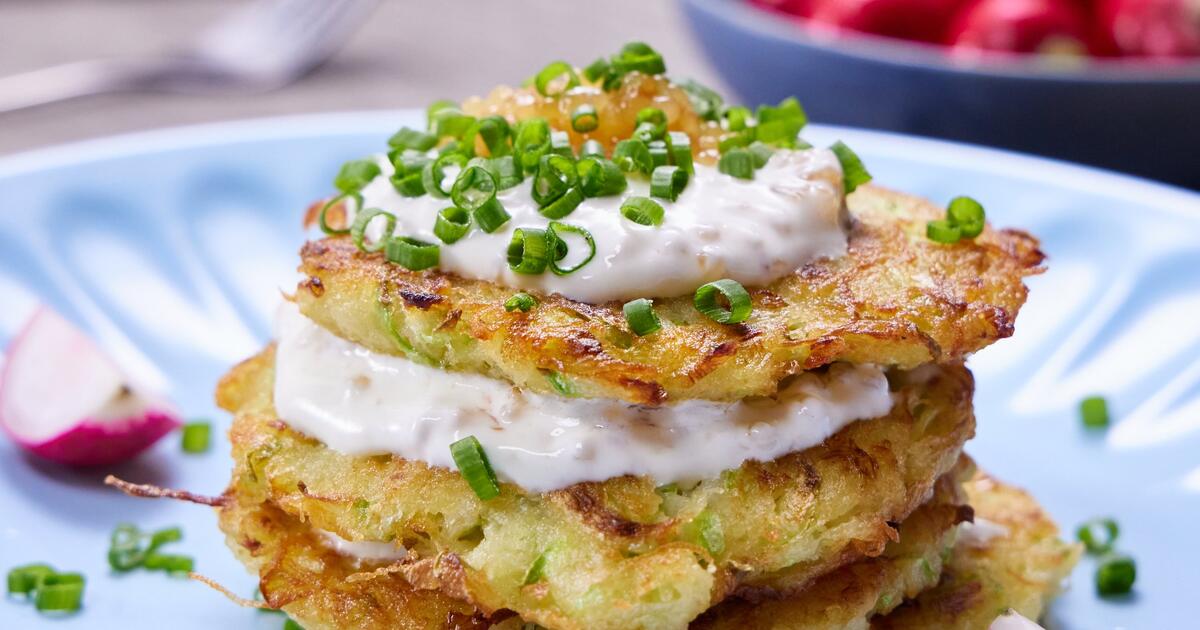 Таким образом, собрать две порции из оладий и соуса.