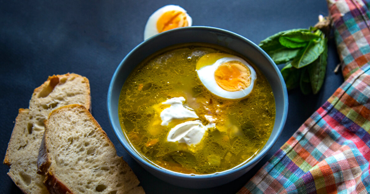 Довести до кипения, добавить яйца и щавель.