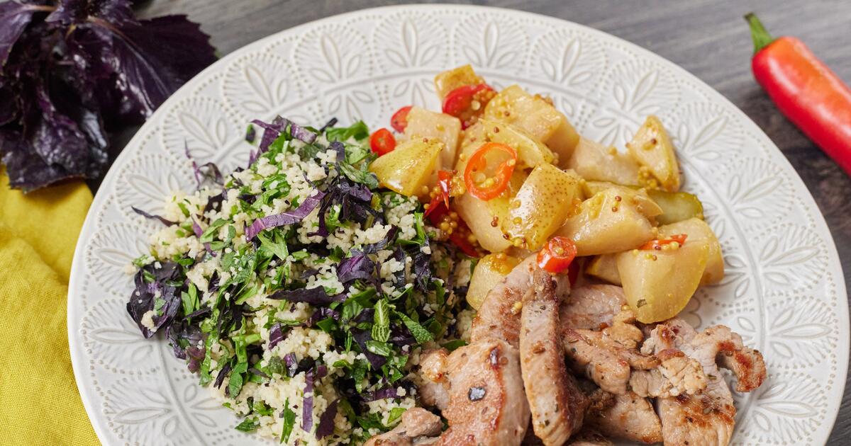 На сервировочную тарелку выложить кускус с зеленью, индейку и чатни.