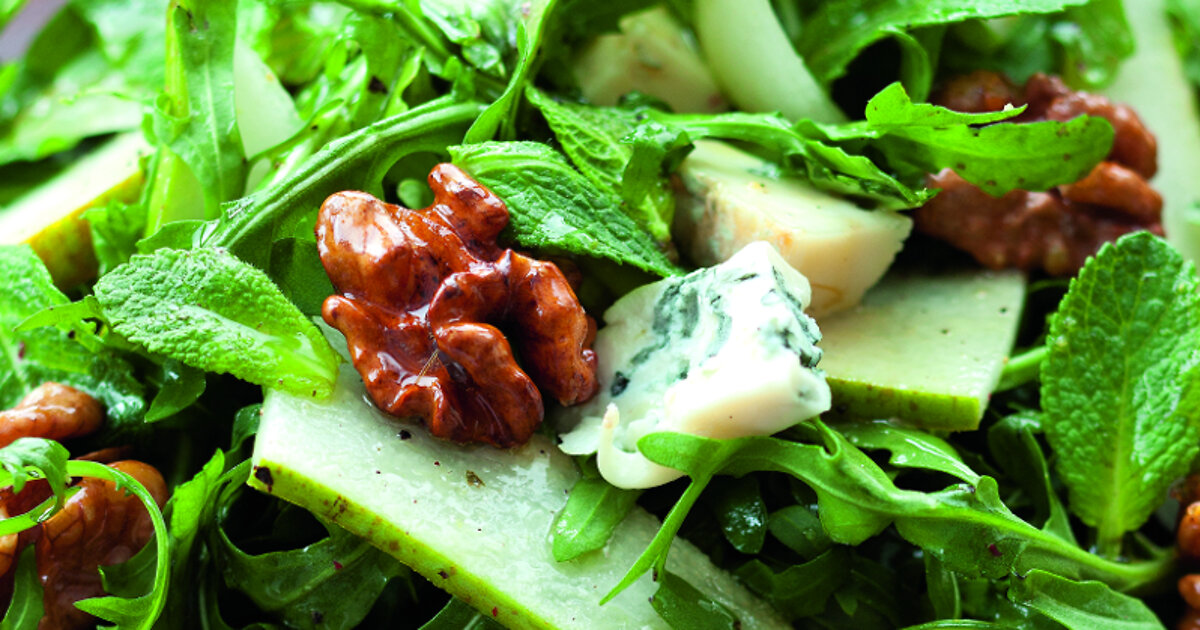 Не секрет, что любой, даже самый скучный зеленый салат, в который попадает рокфор, превращается в чудо. В наш микс войдут не просто листья, а пряная руккола плюс грецкие орехи, обжаренные в меду, и еще сладкие груши для свежести и контраста. В общем, настоящая бомба.