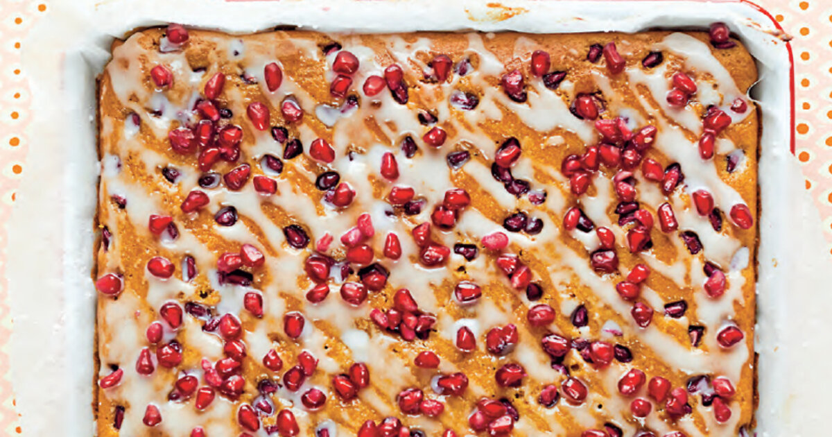 5. Посыпьте тесто половиной зерен граната, поместите в духовку и выпекайте 20–25 минут, пока шпажка из центра не будет выходить сухой.