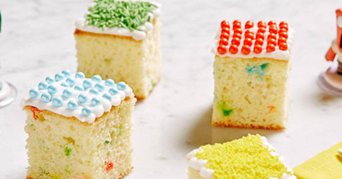 - Разрежьте кекс на равные квадраты со сторонами 5 см.