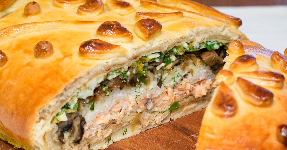 Аккуратно переместите тесто на противень. Сначала распределите рис, оставляя 2-3 см по краям. Сверху посолите и поперчите – повторяйте это с каждым слоем. Затем на рис выложите лук и грибы, затем – филе рыбы. Посыпьте укропом, затем – отдельно вареными желтками и белками. Слои можно варьировать: сначала выложить рыбу, затем рис и лук с грибами.