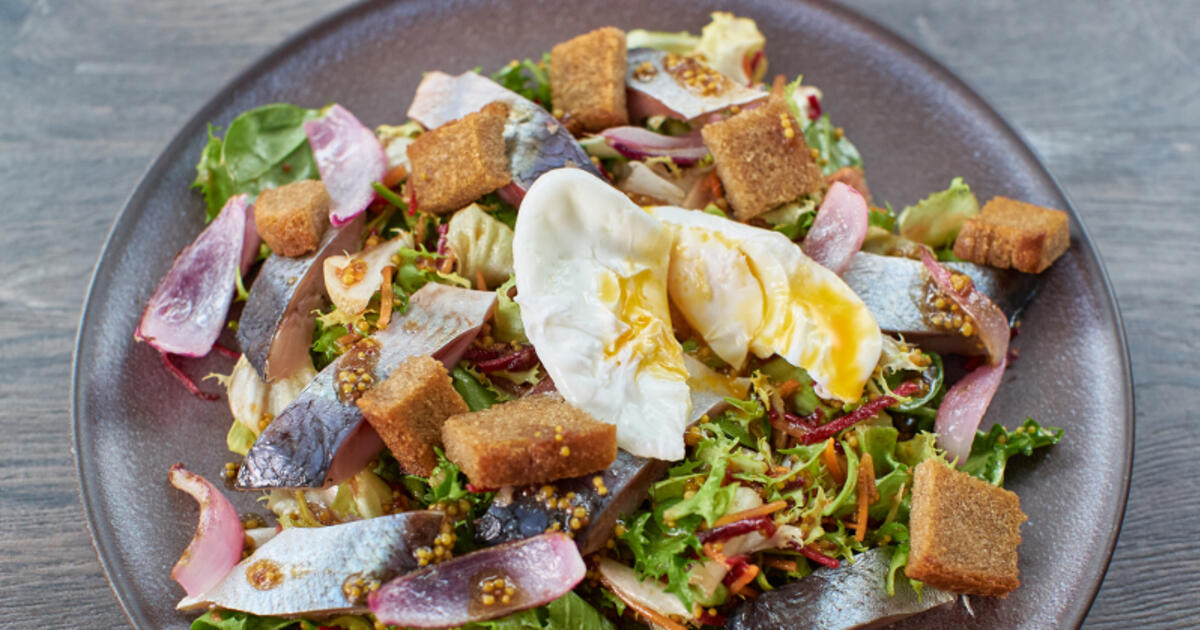 Сервировка: переложить на большую порционную тарелку салатный микс в заправке, выложить на листья кусочки сельди, сухарики с луком и сверху яйцо пашот, поперчить по вкусу.