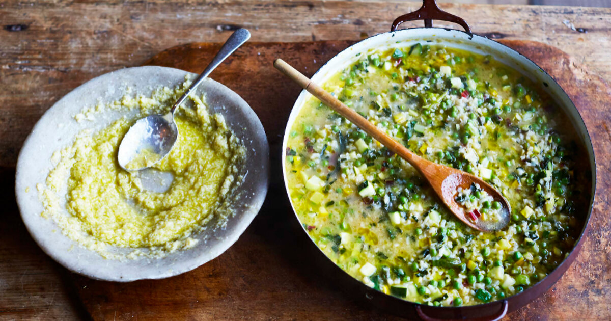 Джейми Оливер: «Обожаю этот минестроне — он свежий и яркий, спасибо лимонному песто! Рис впитывает ароматный бульон, и суп получается очень душевным. Для меня минестроне всегда был беспроигрышным вариантом: он выручал и когда я был студентом, выручает и сейчас, когда я готовлю для детей. Я не перестаю экспериментировать с сезонными продуктами, которые появляются на рынке или в саду, и суп удается на славу».