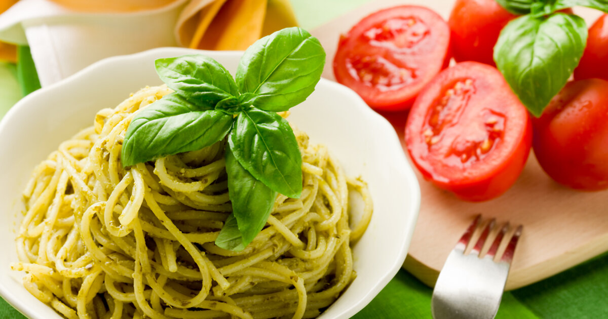 Помойте два пучка базилика и промокните их бумажным полотенцем. Затем базилик, зубчик чеснока и пармезан (100 г) положите в блендер, добавьте 50 г кедровых орешков и 80 г оливкового масла. Тщательно взбейте. Пармезан можно заменить любым другим сортом твердого сыра. Внимание: хранить соус необходимо только в холодильнике и в течение не более двух дней!