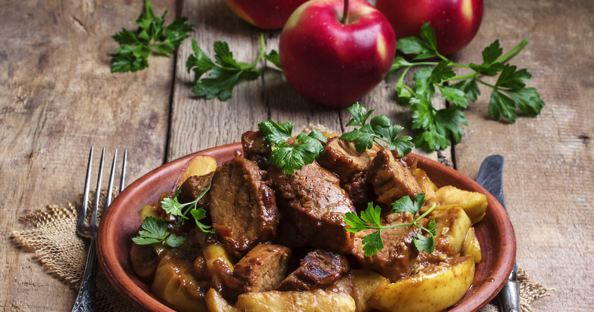 На этой смеси потушить мясо, яблоки и картошку в течение 2-2,5 часов.