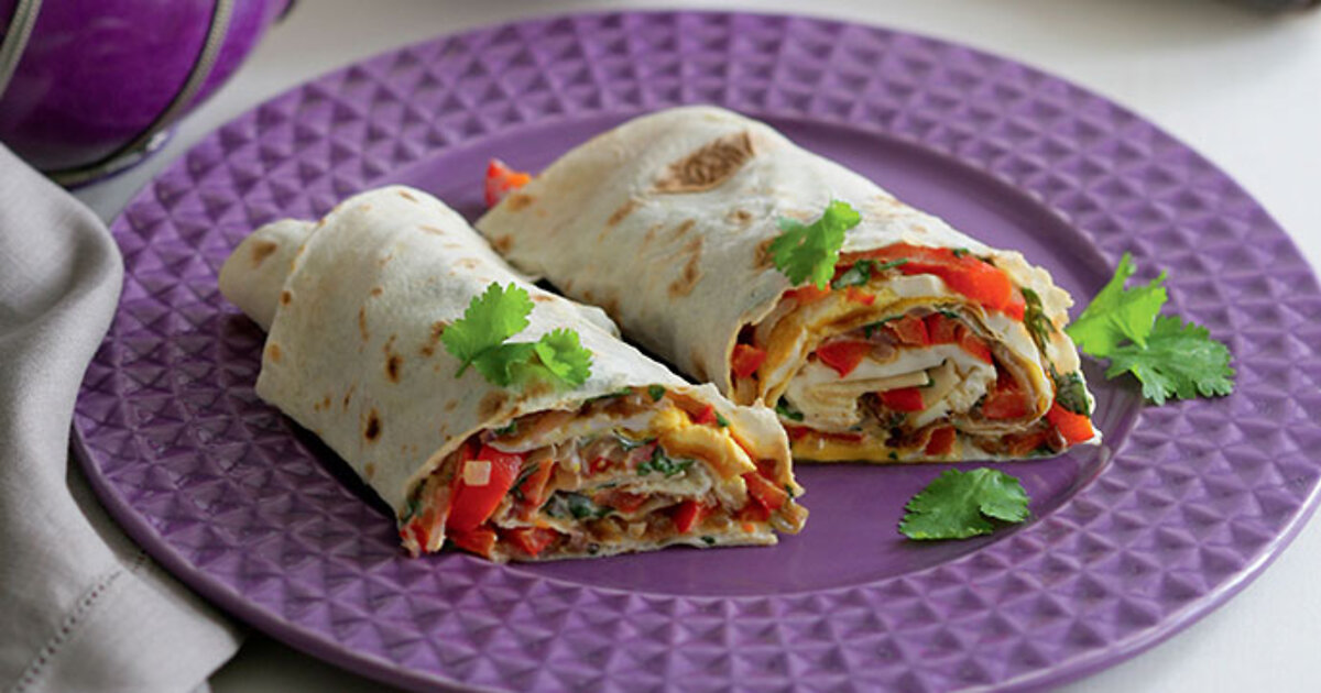 Лаваш с жареными яйцами, сладким перцем и луком