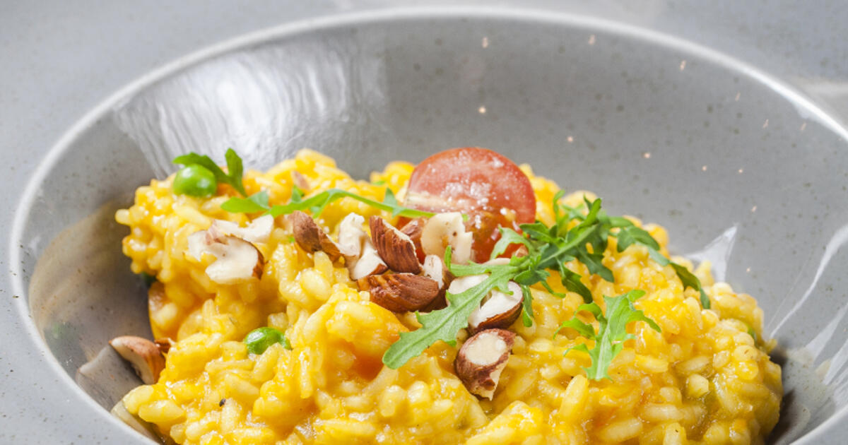 За пять минут до готовности добавить в ризотто запеченную тыкву.