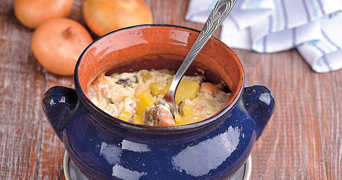 В порционные горшочки положить картофель, лук и грибы, сверху — куски рыбы. Добавить чеснок, растертый с солью, молотый перец.