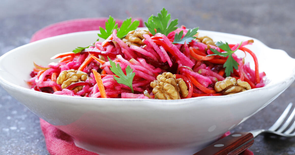 «Измельчите на терке среднего размера свеклу (1 шт.) и морковь (2 шт.). Положите натертые овощи в миску, добавьте к ним орехи — грецкие или кешью (50 г), семена чиа (1 ст. л.). Посолите салат, заправьте оливковым или льняным маслом (1—2 ст. л.) и тщательно перемешайте. Этот салат для меня — спасение в любой командировке, я могу приготовить его в любой точке мира, где бы ни находилась. Делать его просто, он полезный, очень вкусный и отлично утоляет голод».
