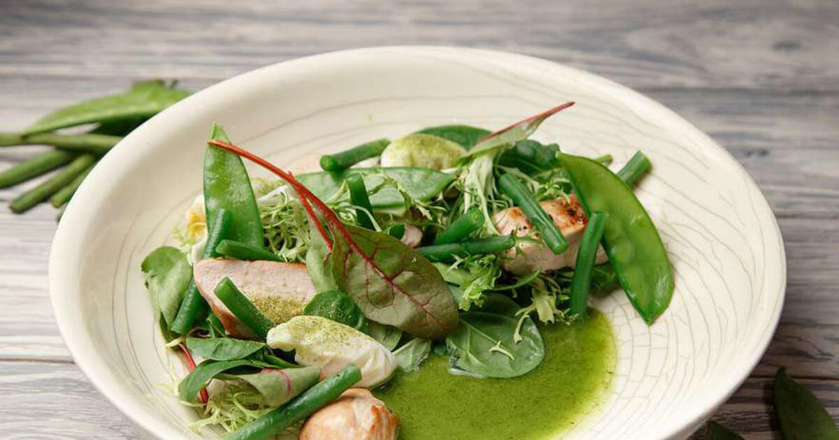 Подача: Птицу цесарку нарежьте слайсами 0,5 см x 0,5 см. На тарелку выложите микс тоскана, фасоль и горох, 3 перепелиных яйца, цесарку и соус.
