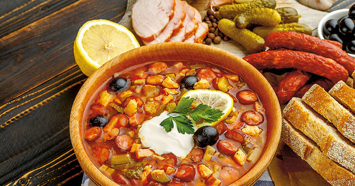 Подавать с оливками и дольками лимона (по желанию — со сметаной).