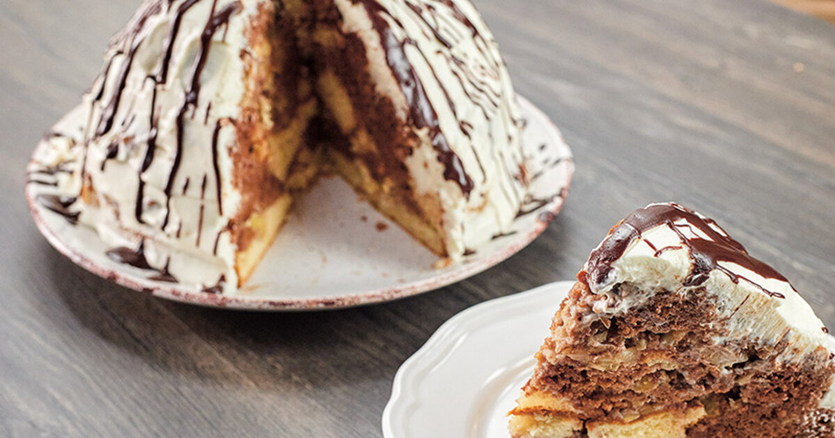 Выстелить пергаментом дно двух форм для выпечки (со съемными бортами, диаметром 22 см), смазать борта и дно маслом, перелить в одну белое тесто, в другую — шоколадное. Отправить формы в заранее разогретую до 180°С духовку на 45 минут.