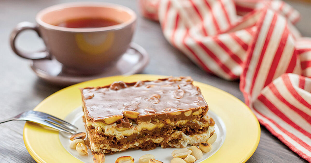 Собрать торт: визуально разделить кусочки бисквита на две части. На дно прямоугольной формы выложить половину измельченного бисквита. Карамель визуально разделить на две части и первой половиной покрыть слой бисквита на блюде. Затем сверху выложить половину крема.