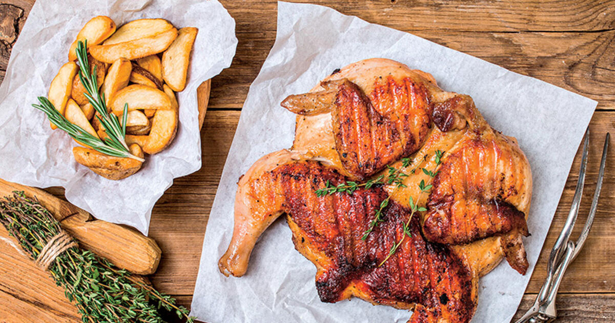 Цыпленка вымыть, обсушить, разрезать вдоль грудки и распластать. Накрыть пленкой и аккуратно отбить, чтобы мясо стало мягким, но кожа осталась целой.