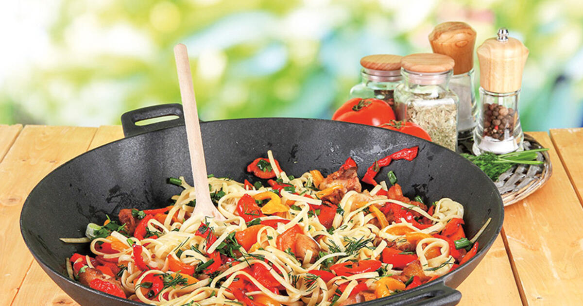 Вок с рисовой лапшой, овощами и курицей