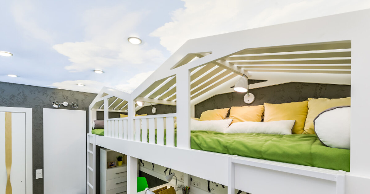 - Потолок в комнате сделали натяжным. На нем печать: по голубому небу плывут пышные облака, полотно подсвечено изнутри, что дает полное ощущение солнечного дня на открытом воздухе.