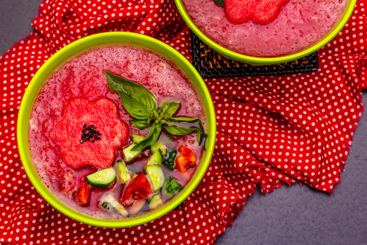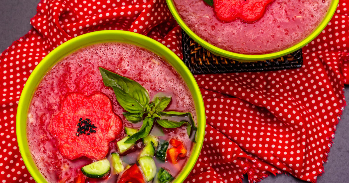 Сезон арбузов вдохновил кулинаров на творчество. И вот уже они предлагают суп-гаспачо, который может заменить в жару традиционную окрошку. А самое главное, готовится буквально за минуты и его не нужно варить. Рецептом поделился канал «Едим Дома» с Юлией Высоцкой.