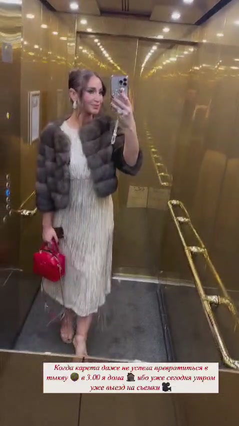 Накануне Нового года певица опубликовала короткое видео из лифта. Звезда спешила на празднование. Артистка выбрала сверкающее платье длины миди, а сверху накинула норковую шубку.