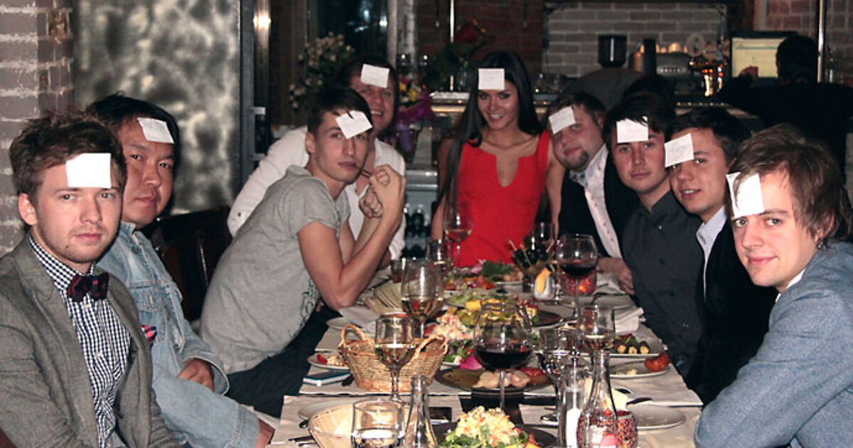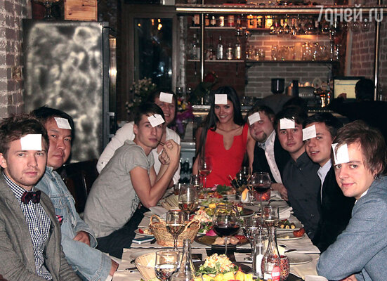 Начало торжества получилось весьма необычным: 12 парней и именинница во главе стола сидели с приклеенными на лбы бумажками, на которых были написаны имена артистов, и с помощью подсказок пытались угадать персону.