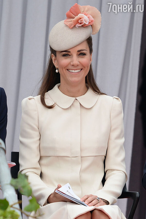 Кейт Миддлтон была одета в жакет кремового цвета, который дополнила туфлями в цвет и маленькой кокетливой шляпкой. На протяжении всего парада герцогиня оживленно общалась с президентом Франции и не скрывала улыбки на своем лице.
