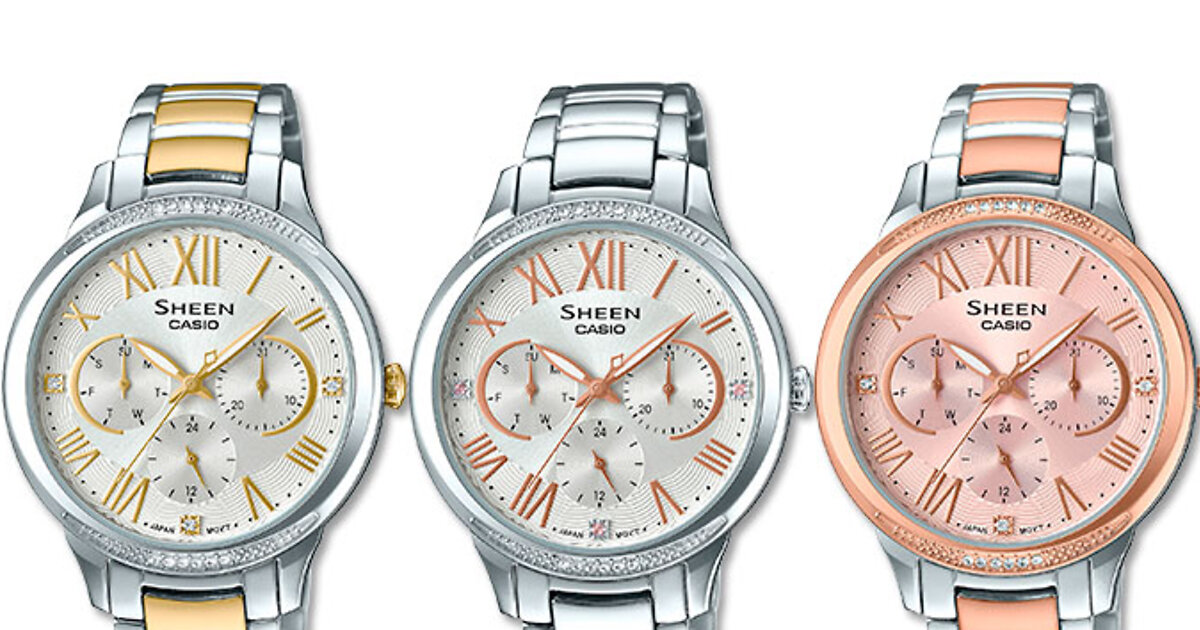 Классическая женская линия часов Sheen пополнилась сразу тремя новыми моделями - SHE-3058SPG-4A, SHE-3058SG-7AU и SHE-3058D-7AU. Их главная отличительная особенность – бeзель украшен кристаллами Swarovski, что придает практичной и в меру строгой модели ноту очарования и женственности. Еще одно интересное решение с точки зрения дизайна – дополнительные циферблаты хронографа (в них отображается текущая дата и день недели) украшены полумесяцами. Все часы оснащены минеральным стеклом, отличающимся прочностью и высоким уровнем устойчивости к царапинам. Браслет новых моделей изготовлен из прочной нержавеющей стали, придающий часам классический, но в то же время изящный внешний вид, что несомненно придется по душе активным жительницам мегаполиса, которые привыкли жить в режиме многозадачности.