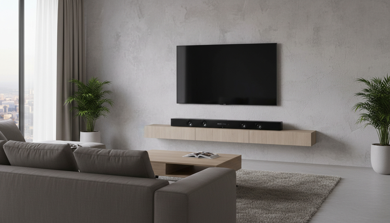 Настенный монтаж освобождает пространство на тумбе и улучшает эстетику интерьера, особенно если телевизор тоже висит на стене. Однако этот вариант требует качественных кронштейнов (обычно идут в комплекте) и правильного выбора высоты установки — саундбар должен находиться на уровне нижней трети экрана для оптимальной направленности звука.