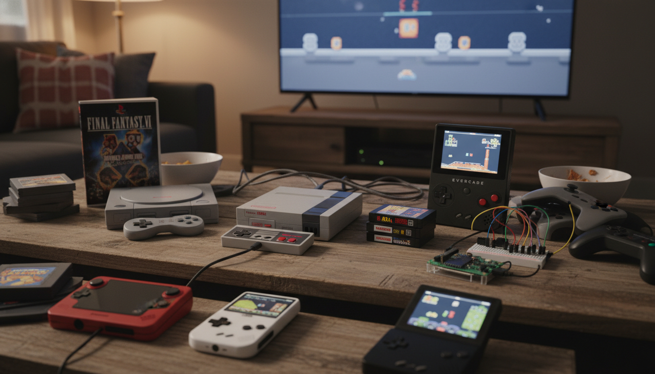 Для ностальгии по классике бюджетный вариант — официальные мини-консоли Nintendo (NES/SNES Classic) или PlayStation Classic с легальными наборами хитов эпохи. Более гибкий вариант — портативная ретро-консоль Anbernic или Miyoo Mini с эмуляторами игр до PlayStation 1. Для технически подкованных энтузиастов — эмуляционная станция на Raspberry Pi, позволяющая создать кастомную ретро-аркаду с тысячами игр разных платформ. Nintendo Switch также дает доступ к классике через подписку Nintendo Switch Online с библиотеками NES, SNES и Game Boy.