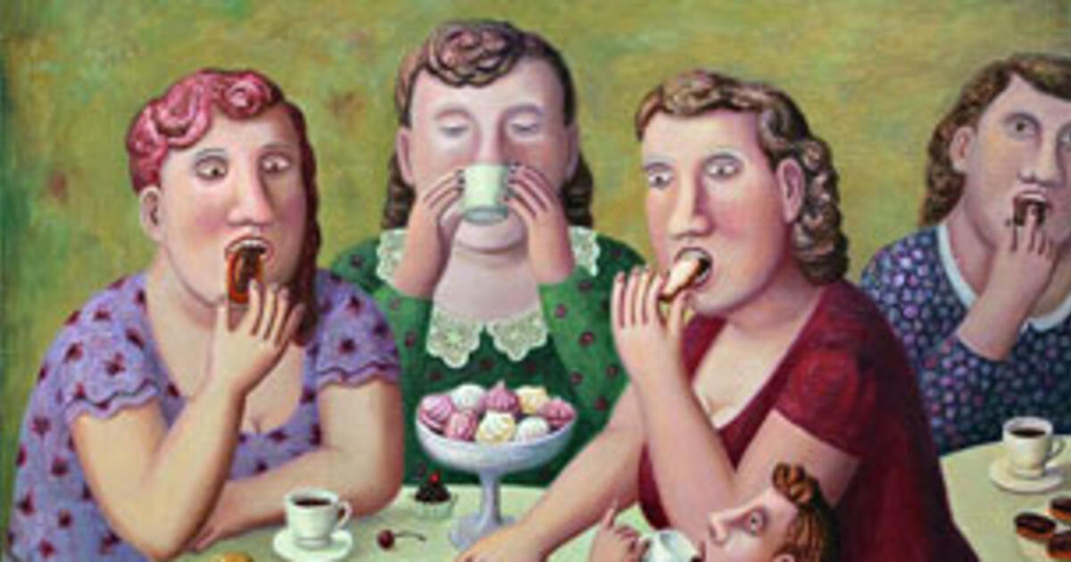 Герои живописных серий Владимира Любарова «Город Щипок» и «Деревня Перемилово» стали уже для многих хорошими знакомыми. Эти веселые русские люди живут такой бурной жизнью, что остается только позавидовать. Особенную зависть вызывает их аппетит. В новой серии «Едоки» все едят. И у каждого едока на столе, стуле, газетке, травке натюрмортом разложена вся его история. Художник не ставит себе