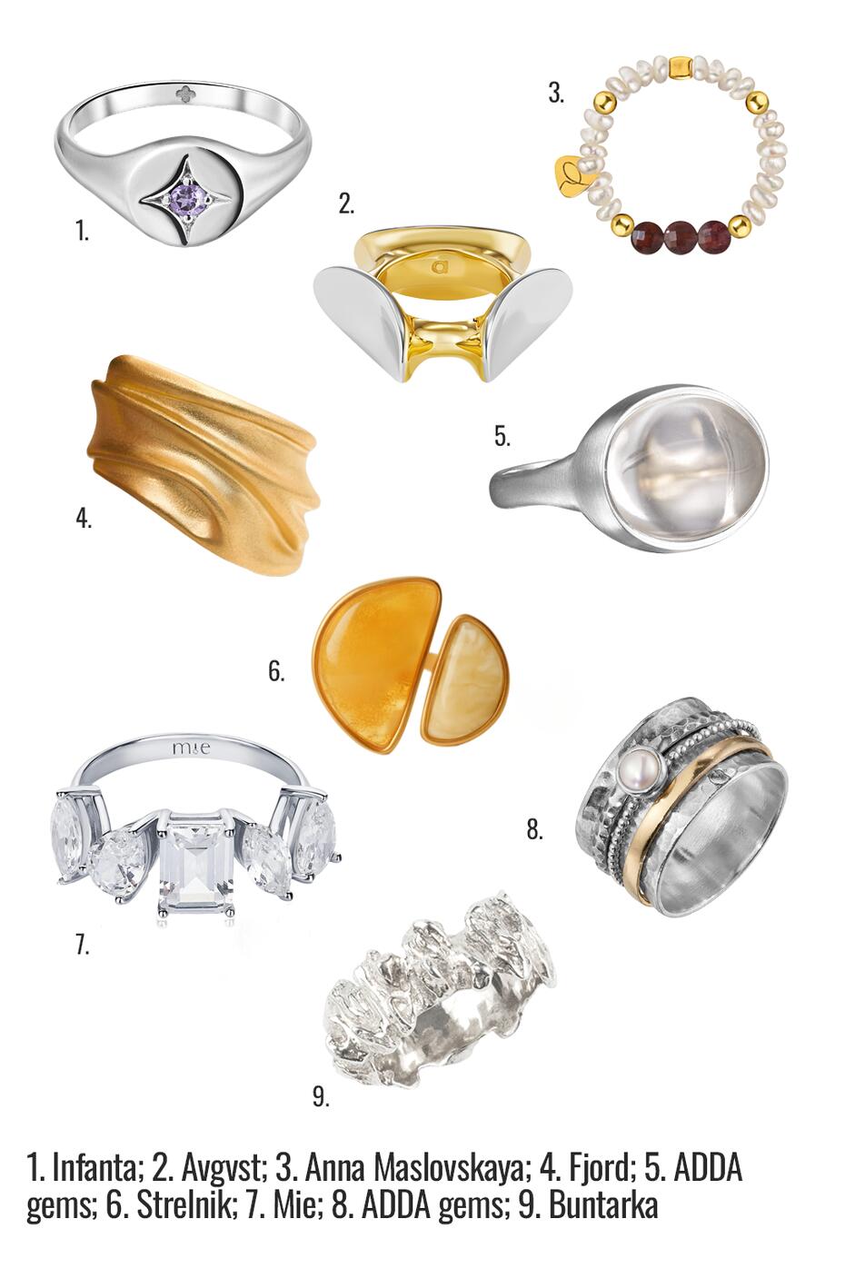 Сезон диктует моду на кольца с необычными узорами и микс металлов. Носите серебро с золотом, добавляйте текстуру «под кору дерева» или крупные камни. Кольца должны быть заметными — надевайте по 3-4 штуки на один палец или закрывайте сразу две фаланги.