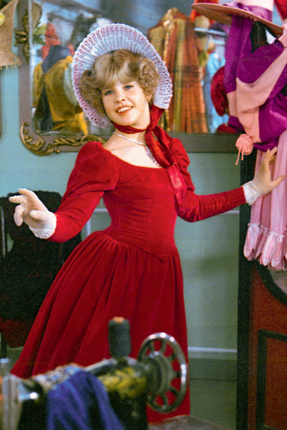 Большой поклонницей бархата была и Людмила Гурченко. Она носила платья из этого материала и во время своих концертных выступлений, и в быту. В одном из интервью актриса призналась: «Мои любимые материалы — шифон, бархат и атлас». Людмила Марковна была настоящей рукодельницей и любила усовершенствовать вещи, купленные в магазине. Она могла взять новое, только что приобретенное бархатное платье и пристрочить к нему кружевной воротник и манжеты от своего старого туалета. В СССР из бархата часто шили сценические костюмы для спектаклей классического репертуара — от Гоголя до Чехова. А уж в киноэкранизациях произведений классической литературы он вообще шел на ура. Героиня Татьяны Догилевой в комедии «Вакансия» по мотивам пьесы Островского «Доходное место» носила туалет из бархата.