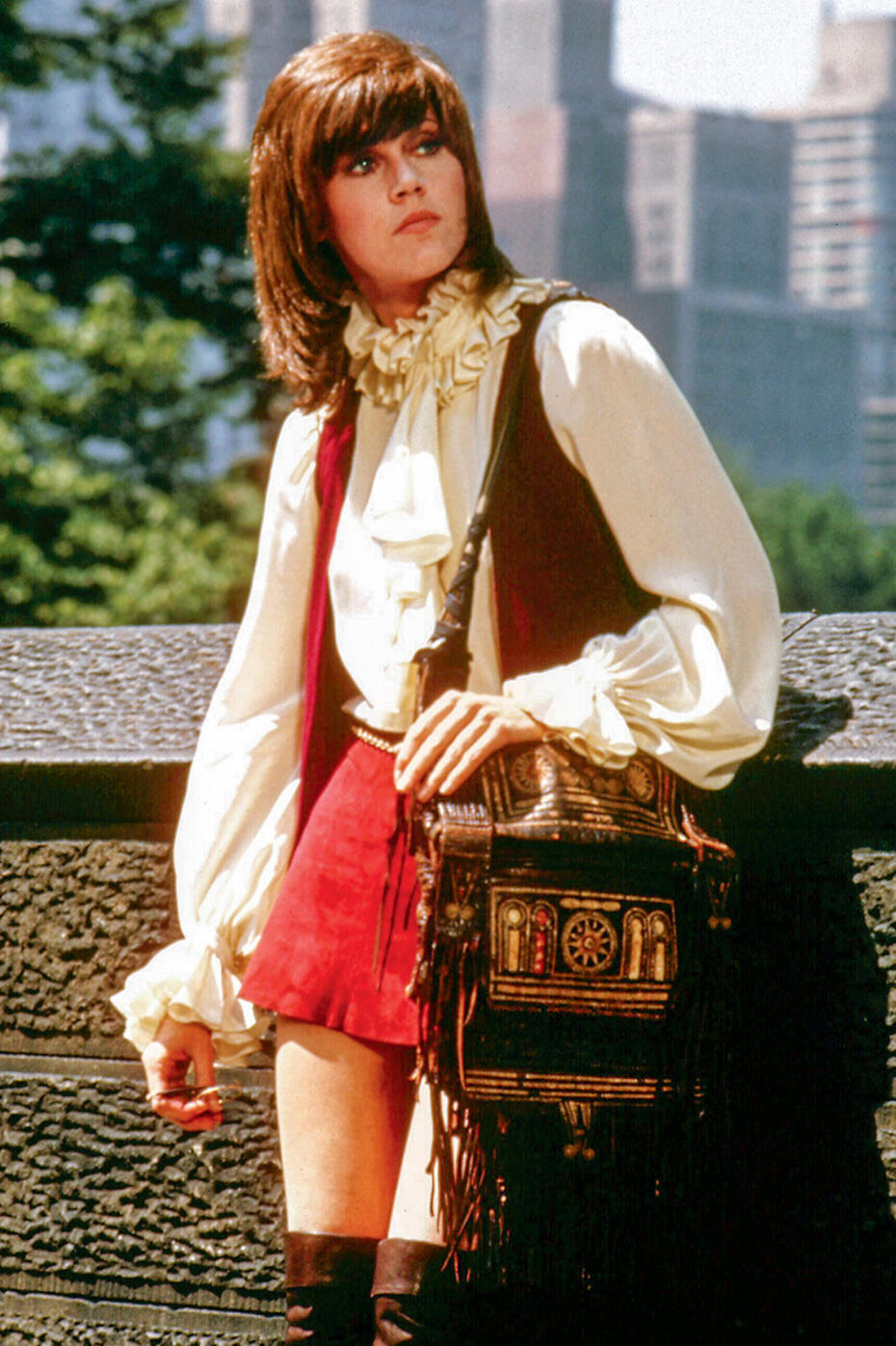 В 1970-е в мире наступил настоящий бархатный бум. Модницы тех лет обязательно имели в своих гардеробах хоть какие-то вещи из бархата. Как у героини триллера про серийного маньяка «Клют» 1971 года. Джейн Фонда сыграла в нем «девушку по вызову» по имени Бри Дэниел. Ее героиня носила бархатную жилетку — в то время очень модную вещь. Ее можно было надеть не только с блузкой, но и с популярной тогда водолазкой. Как видите, героиня Фонды сочетает жилетку из бархата с мини-юбкой. Но на ее месте могли бы быть и брюки клеш.